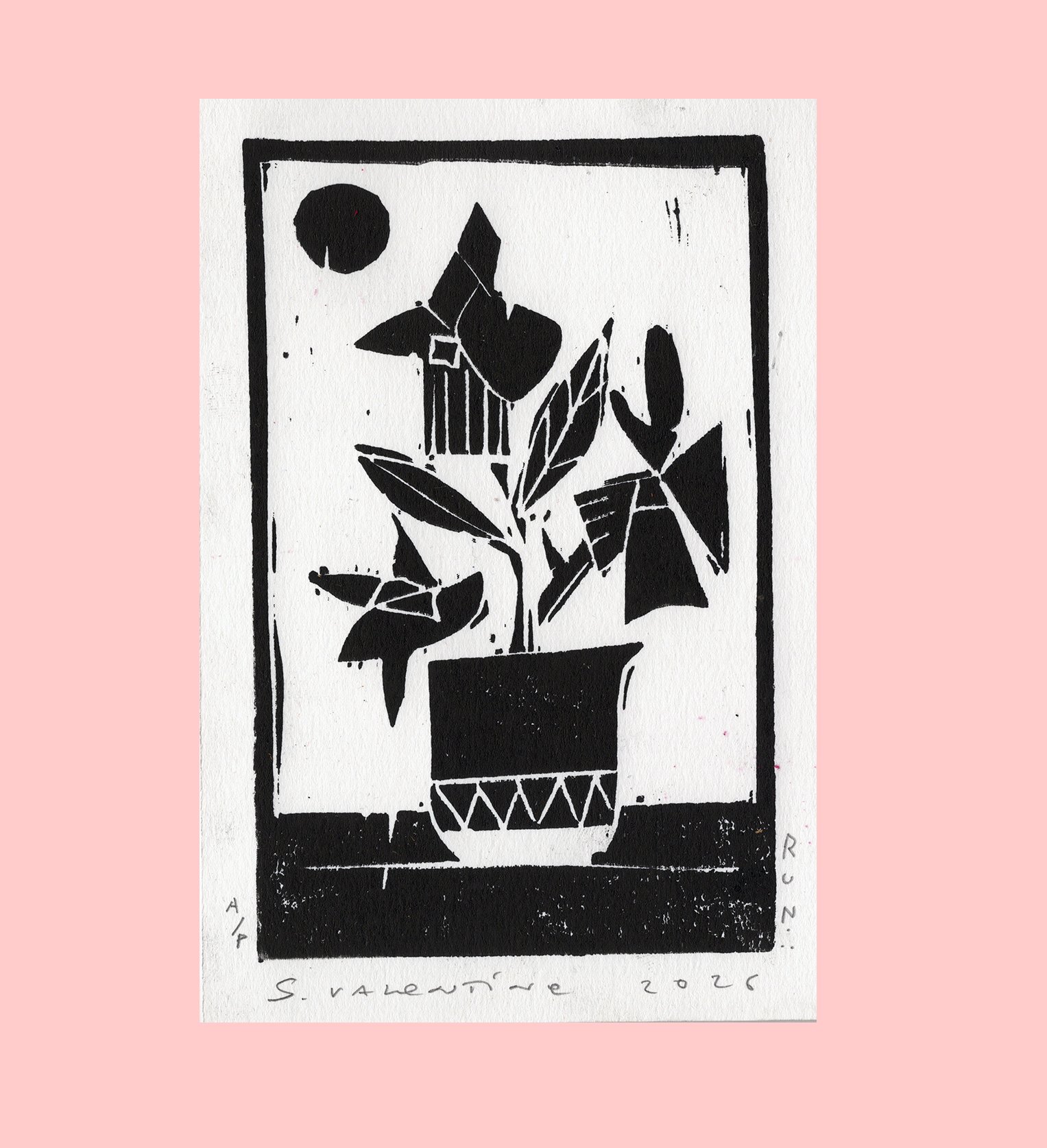 A small size linocut, Un numbered but signed and dated 2026. 11 x 17 cm. Black and white or red. Relief ink on paper